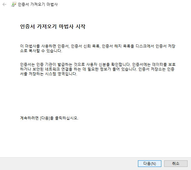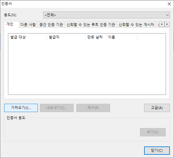 2. 인증서 팝업창에서 "가져오기"를 선택하여 줍니다.