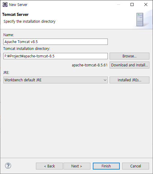 3. Tomcat 을 추가하기 위하여 리스트의 apache 폴더 안의 Tomcat 을 자신의 PC에 맞는 버전으로 선택하여 줍니다. 저는 Tomcat 8.5가 설치되어 있기 때문에 "Tomcat v8.5 Server"를 선택하였습니다. 그리고 Tomcat 이 설치된 경로를 잡아주고 완료합니다.