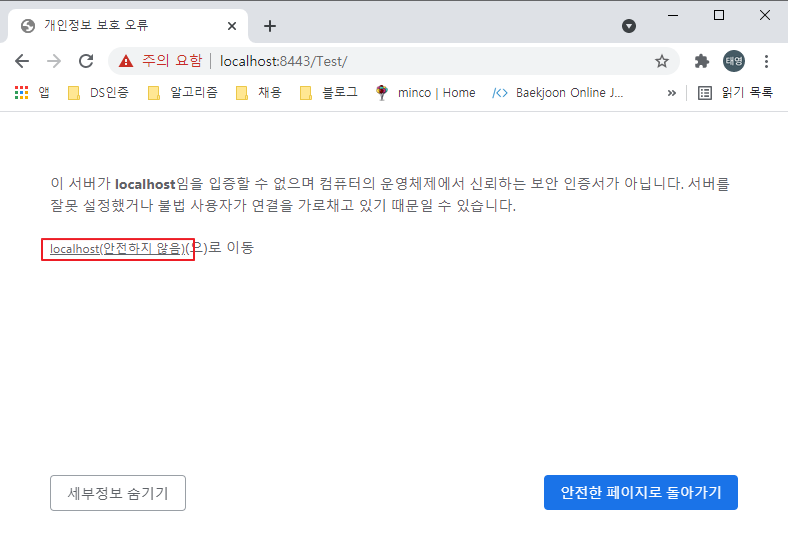 설정이 완료되었다면 Tomcat을 구동하여 "https://localhost:8443/Test/" 로 접속합니다. 그런데 아래 그림과 같이 안전하지 않은 사이트라고 판단을 하여 위험 화면이 나타납니다. 이는 신뢰하는 보안 인증서가 아니기 때문에 아래와 같이 위험 화면이 나타나는 것으로 화면 하단의 "고급" 버튼을 클릭하여 "localhost(안전하지않음)으로 이동" 을 클릭하면 정상적으로 페이지가 출력됩니다.