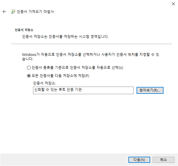 4. 인증서를 저장하는 부분은 "모든 인증서를 다음 장소에 저장" 선택 후, 인증서 저장장소는 찾아보기로 "신최할 수 있는 루트 인증 기관"을 선택하여 다음으로 진행하고 마법사를 완료합니다. "마침" 버튼을 클릭하면 보안 경고가 나오는데, "예"를 눌러 설치를 마무리 합니다.