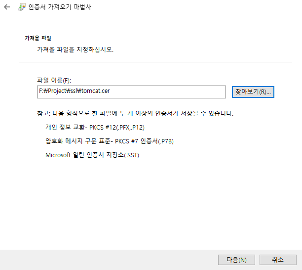 3. 인증서 가져오기 마법사가 실행되며 다음을 눌러 진행합니다. 이때 파일을 선택하는 화면에서 위에서 만들어준 "tomcat.cer" 파일을 찾아보기하여 선택합니다.