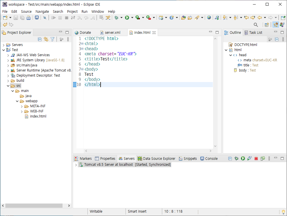 저는 이클립스를 사용할 것이기 때문에 아래와 같이 간단하게 Tomcat 서버 설정 후 Test 라는 프로젝트를 만들어 테스트를 진행하였습니다. 우선 http 통신과 Test 프로젝트가 동작되는 환경을 구성합니다.
