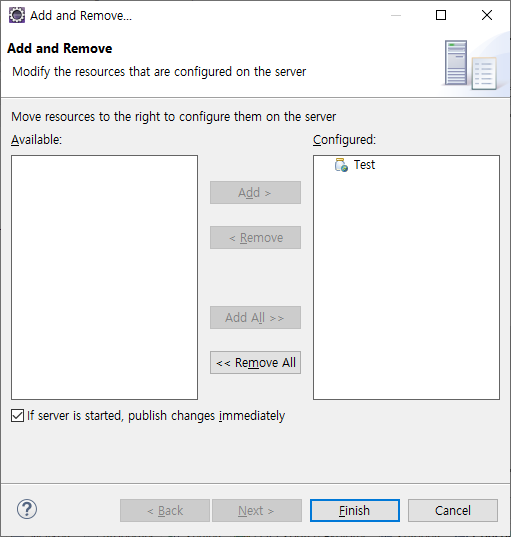 4. 간단한 Test 프로젝트를 생성하고 "index.html" 파일을 만들어 줍니다. 그리고 Severs 탭에서 Tomcat v8.5에 마우스 오른쪽 버튼으로 나오는 메뉴 [Add and Remove] 선택합니다. Test 프로젝트를 Add 버튼으로 오른쪽으로 옮겨 줍니다.