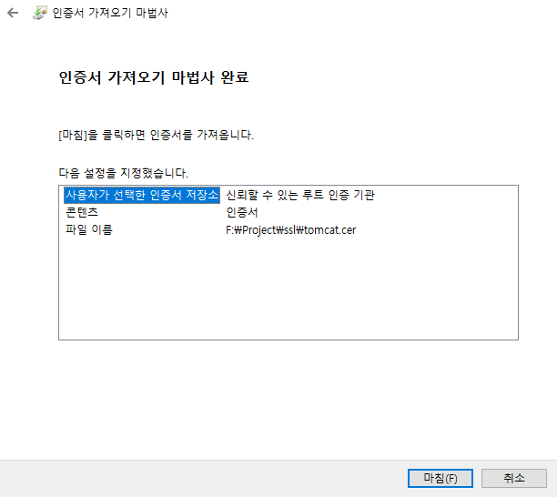 인증서가 <f:\Project\ssl\tomcat.cer> 파일에 저장되었습니다.