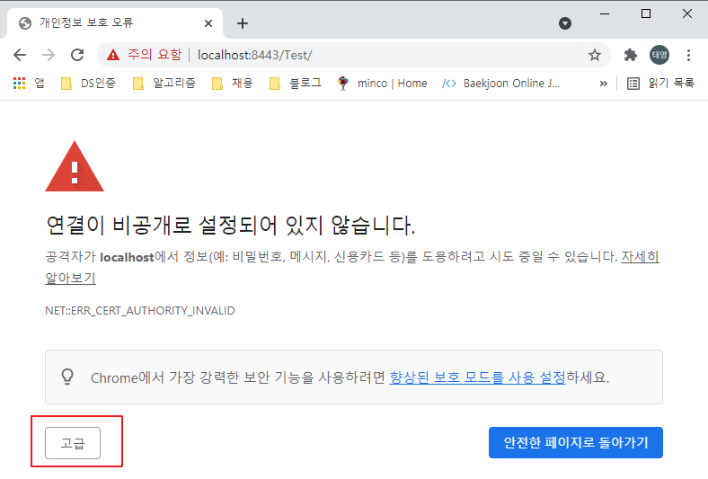 이러한 위험 페이지가 계속 나타난다면 개발하기 귀찮아 집니다. 그래서 아래와 같이 인증서를 브라우저에 등록하여 위험 페이지가 나오지 않다록 설정할 수 있습니다. 저는 크롬을 기반으로 설명을 하도록 하겠습니다.
