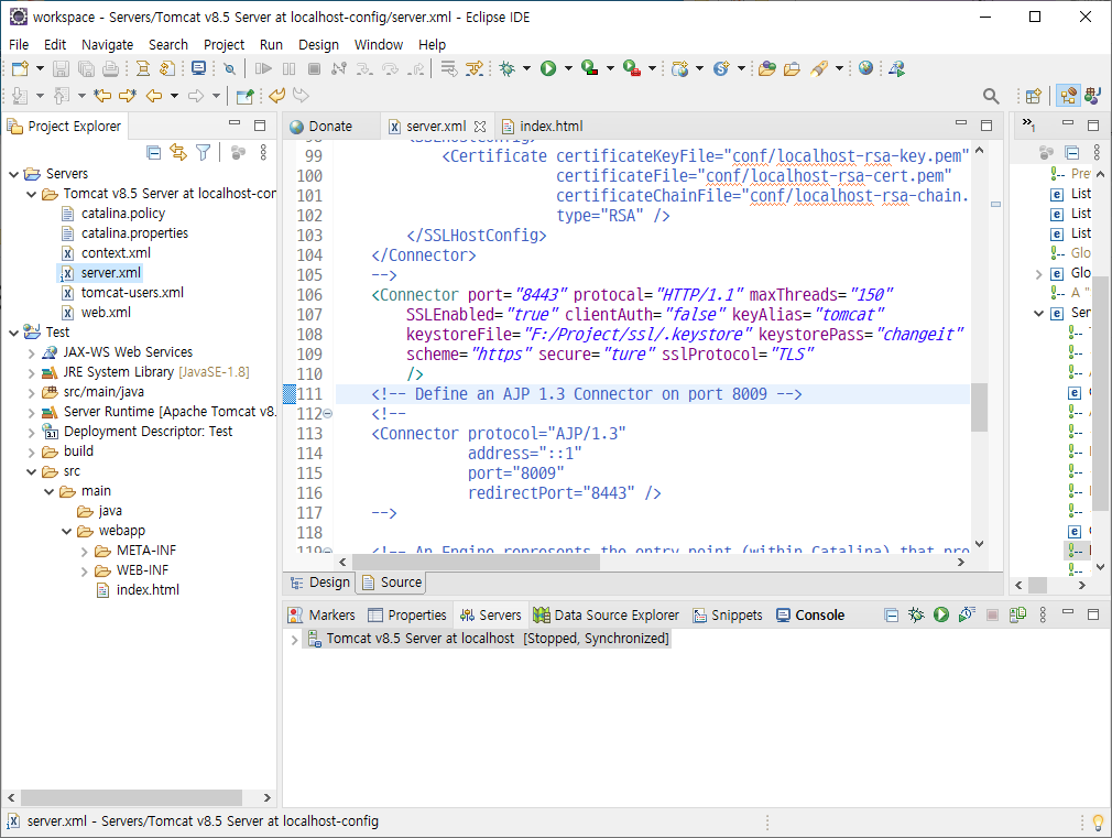 그렇다면 이제 Tomcat 설정 파일 server.xml 파일을 열어 SSL 통신을 위한 Connector 에 등록합니다. server.xml 파일은 아래와 같은 위치에 있으니 참고하십시오.